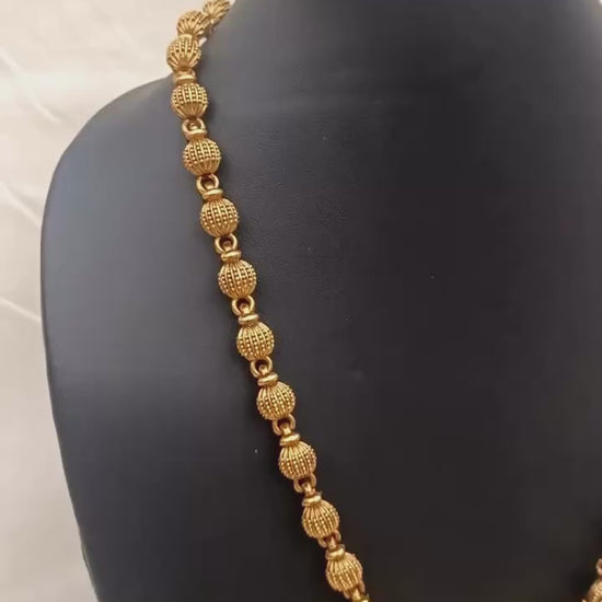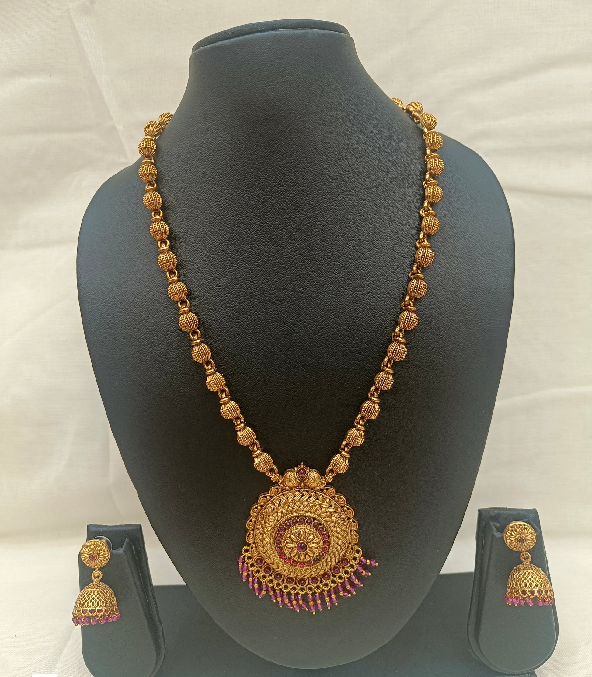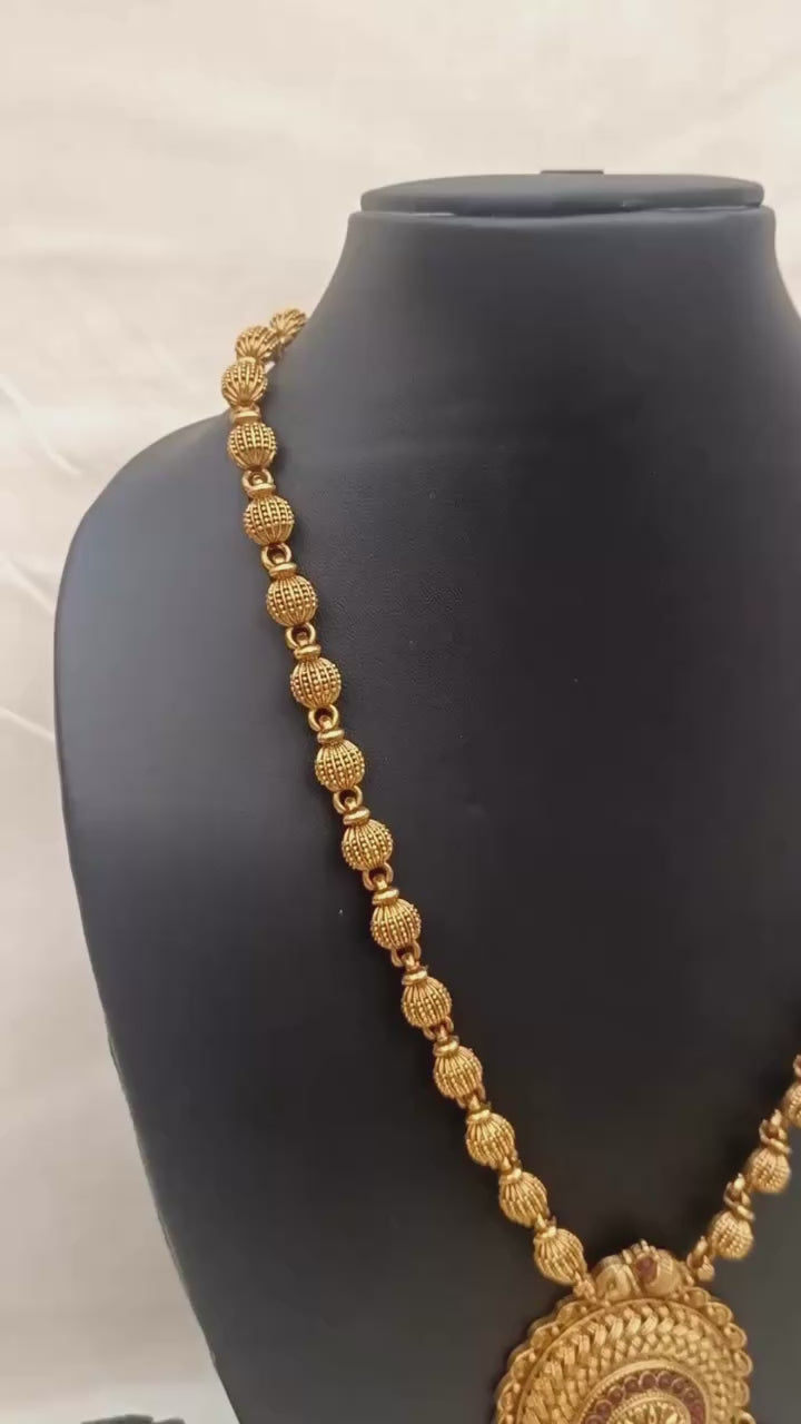 This antique gold necklace set features a bold Lakshmi-inspired circular pendant adorned with intricate carvings, ruby-red stones, and delicate bead danglings for a royal finish. The chain is designed with traditional gold balls, enhancing its ethnic appeal. Paired with matching jhumka earrings, this set is perfect for weddings, festive occasions, and cultural celebrations.