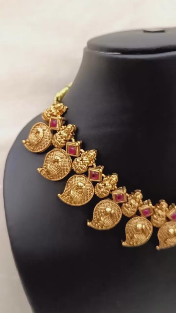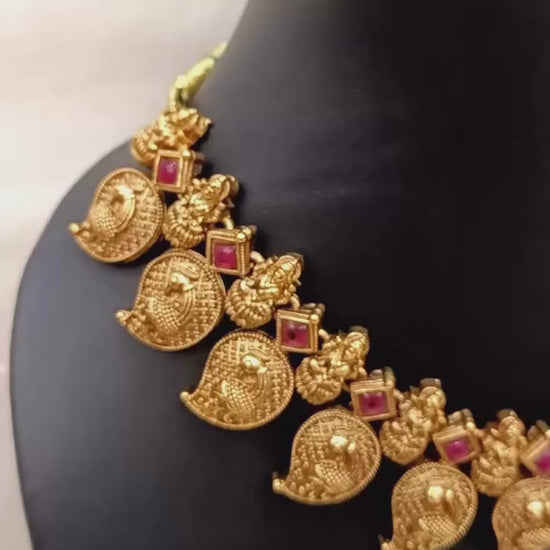 This antique gold temple necklace set showcases traditional coin motifs featuring goddess Lakshmi, beautifully paired with ruby-red stone embellishments. The intricate craftsmanship and temple-inspired design make it a timeless piece for weddings, festivals, and cultural occasions. Comes with matching earrings for a complete ethnic look.