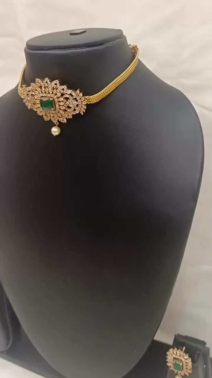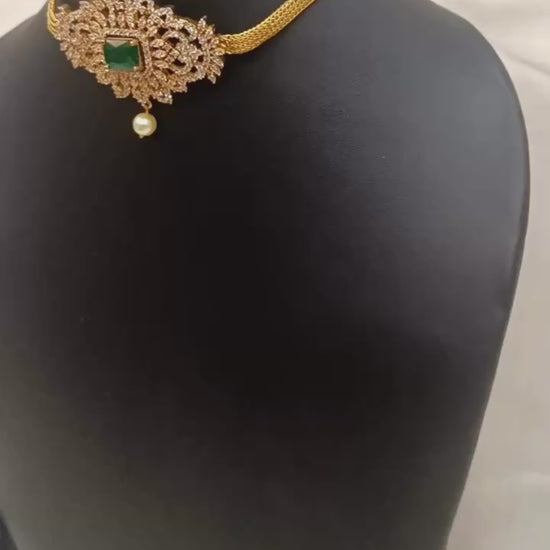 Add a touch of timeless elegance to your collection with this Green Stone Choker Set. Featuring a dazzling emerald-green centerpiece surrounded by sparkling CZ stones, this choker exudes sophistication and charm. The delicate pearl drop adds a graceful finish, making it perfect for special occasions.