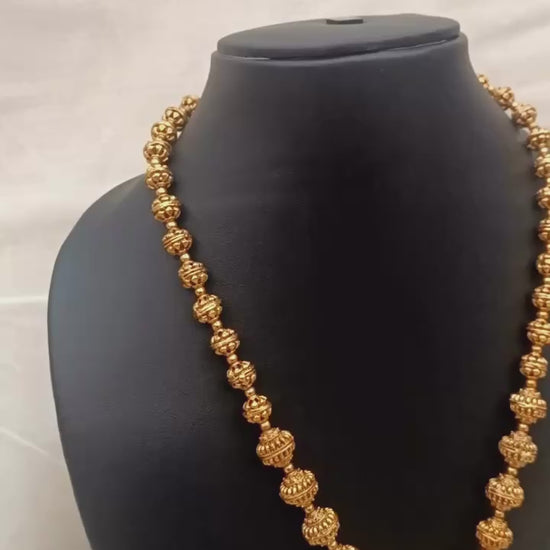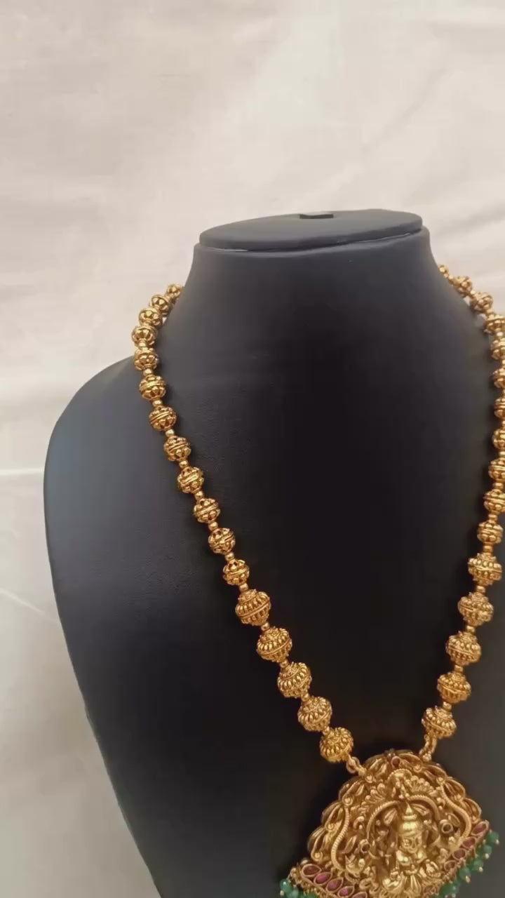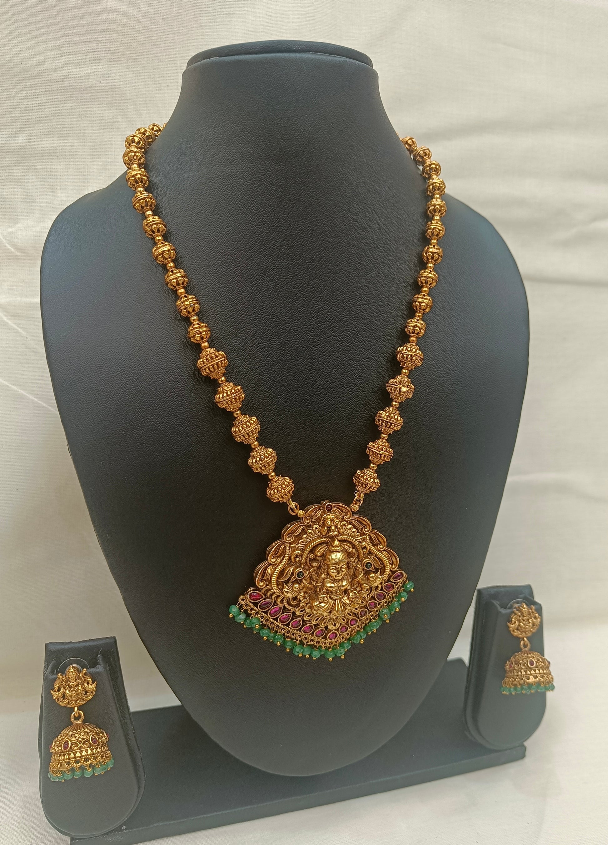 Elevate your ethnic charm with this exquisite Lakshmi Temple Necklace Set, crafted in antique gold finish. The centerpiece features a beautifully carved Goddess Lakshmi motif, symbolizing prosperity and grace. The necklace is adorned with intricate golden beads along the mala, complemented by vibrant ruby and emerald stones that enhance its regal appeal.
