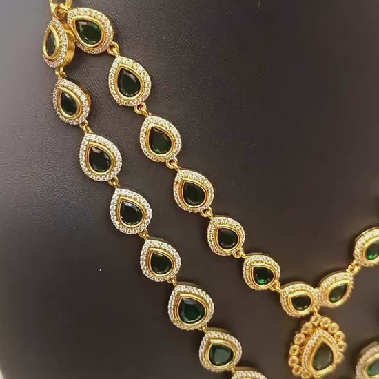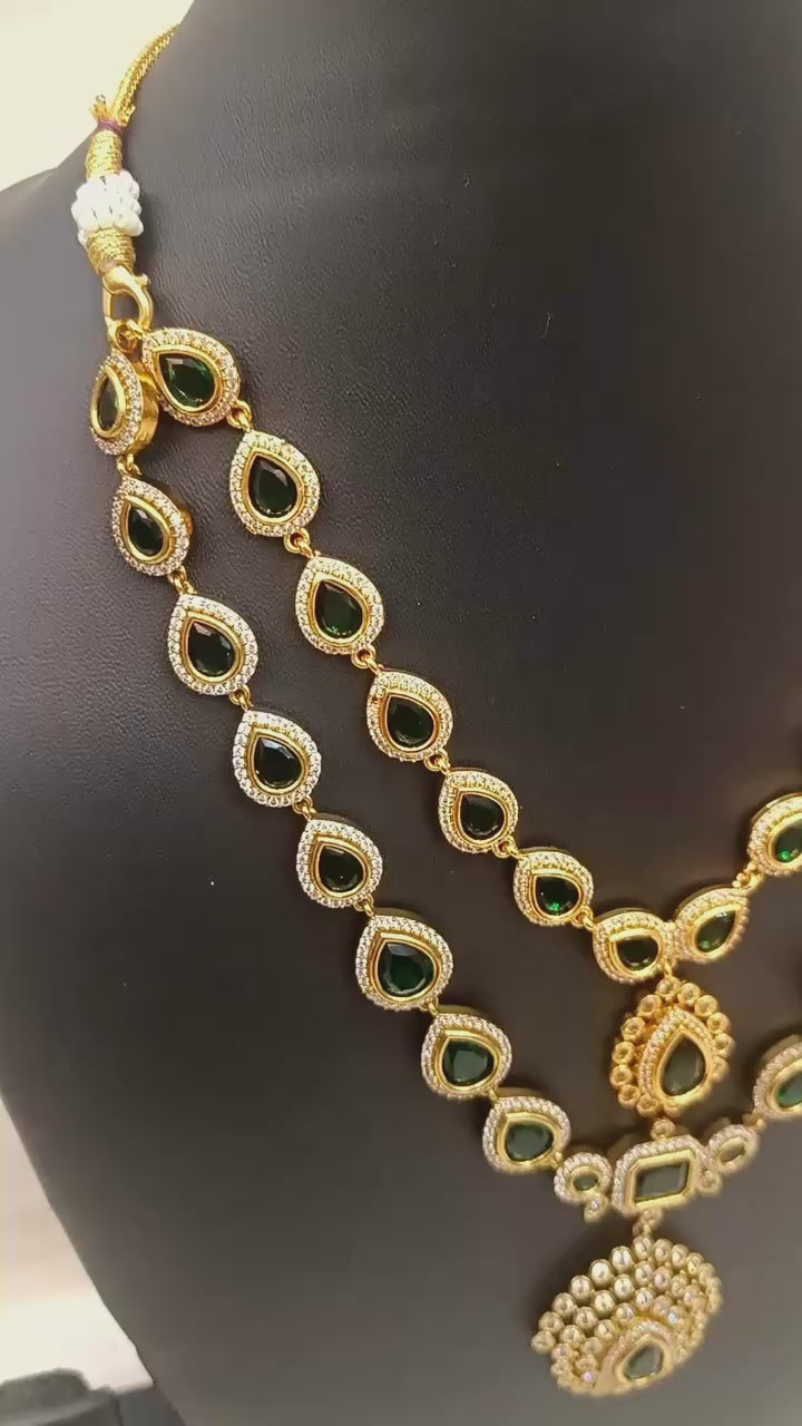 Make a statement with this luxurious double-layered antique necklace set, crafted with precision and elegance. The necklace features emerald-green teardrop stones bordered with sparkling white accents, arranged in two layers for a regal effect.