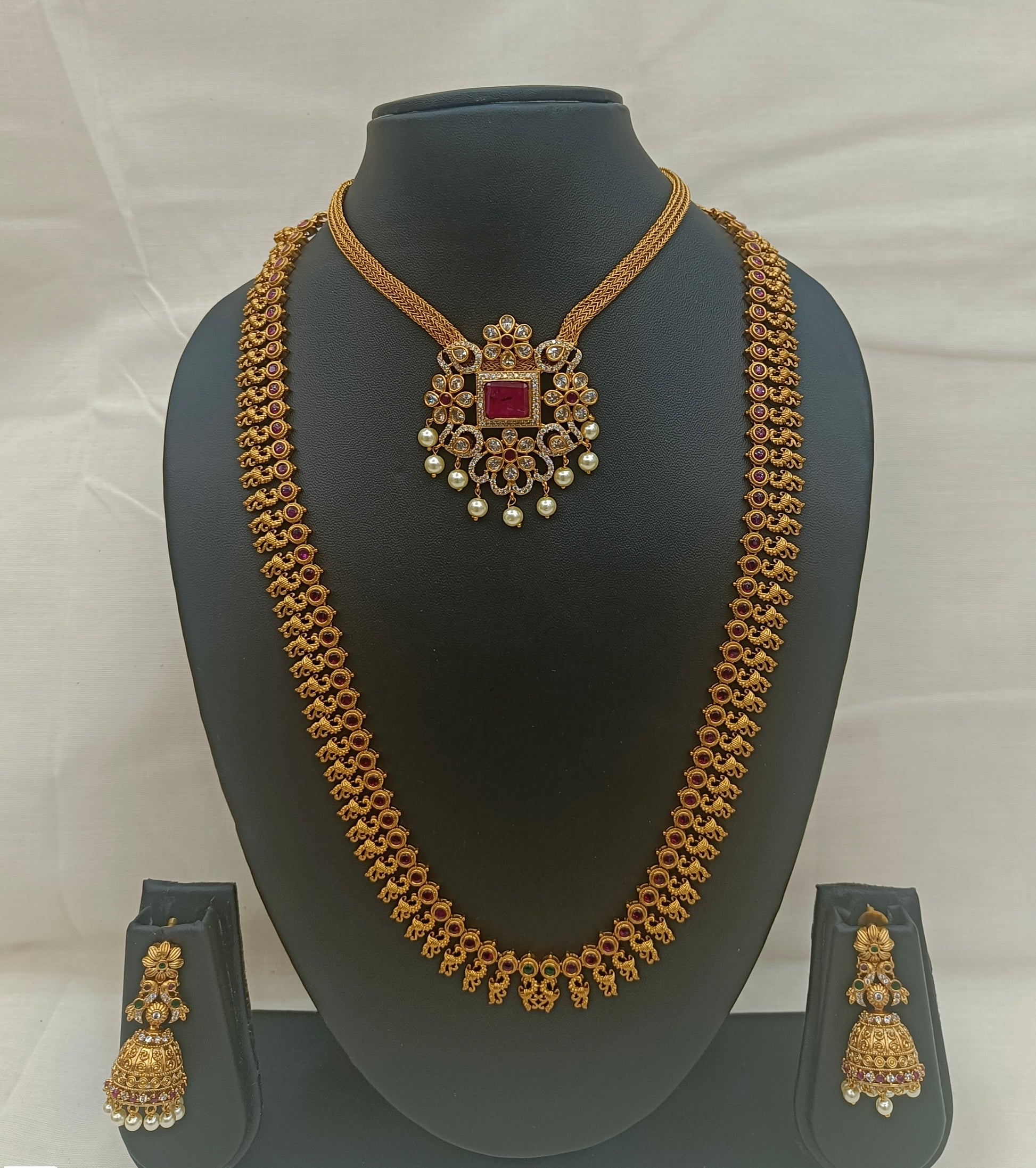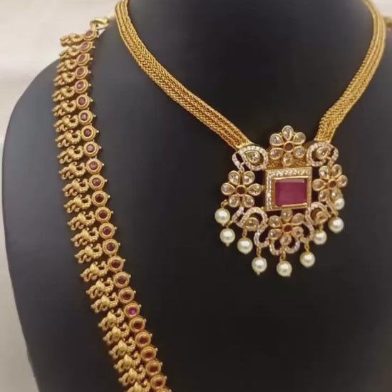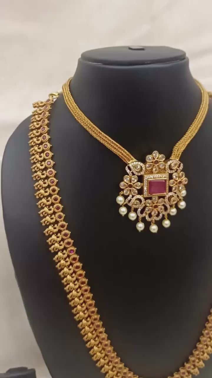 - Design: Temple-inspired long haram with grand pendant